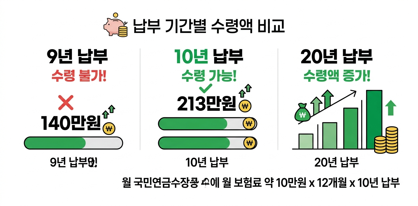 - 10년 미납 채우면 수령 가능, 납부 기간 늘수록 수령액 증가